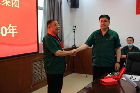 兴柏集团党支部书记刘须华给在党50年员工张路平颁发纪念章及优秀党员证书